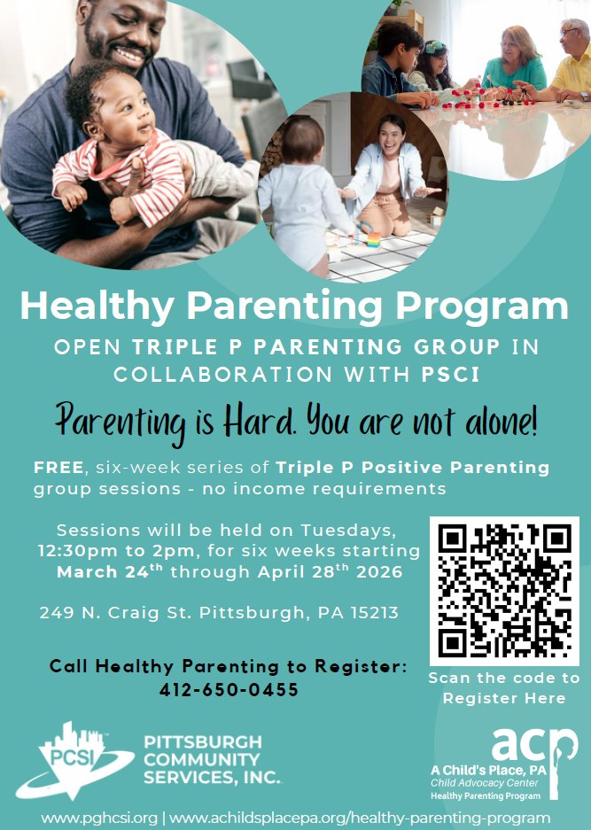 Parenting is hard, and support can make a difference. Pittsburgh Community Services, Inc. (PCSI) is partnering with A Child’s Place PA – Healthy Parenting Program to offer a free Triple P (Positive Parenting Program) group for parents and caregivers in our community. Participants will learn practical strategies for managing behavior, setting routines, building positive relationships, and strengthening parenting confidence. To register, call 412-650-0455 or fill out the form on the flyer.