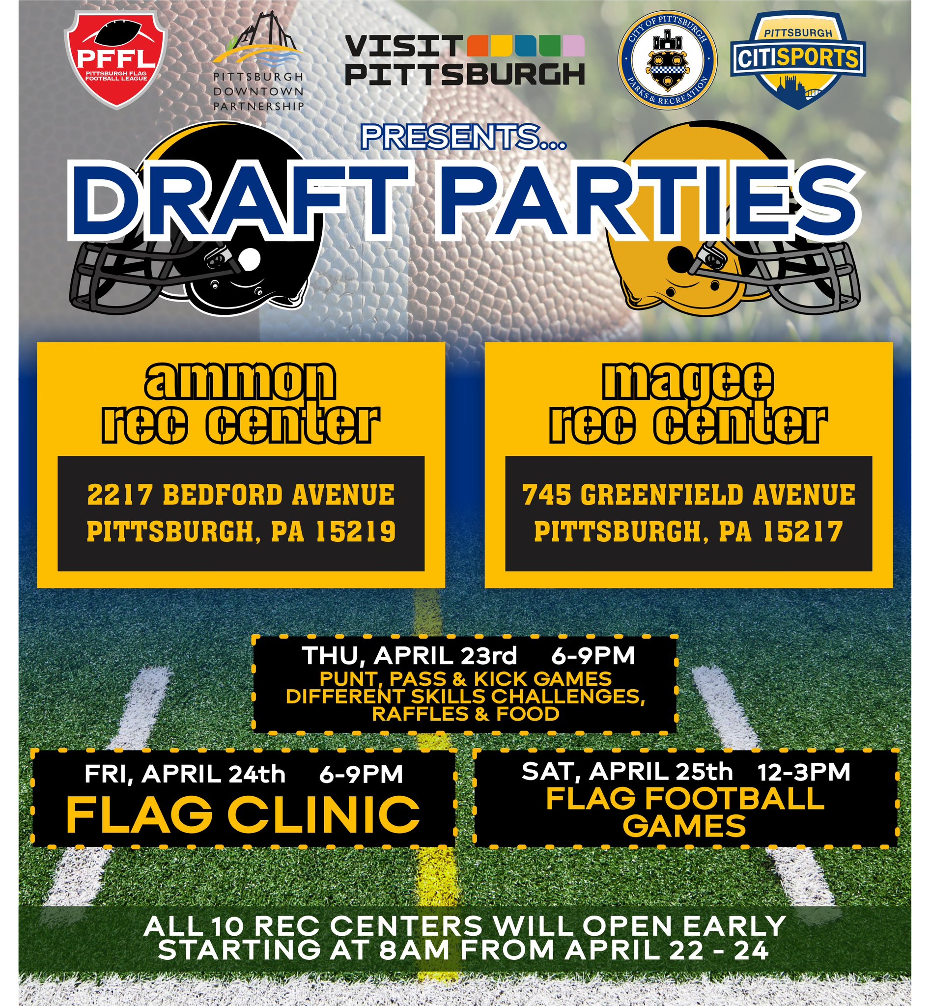 🏈 Get ready for Draft week fun, Pittsburgh! From April 22–24, all CitiParks Rec Centers open early at 8 AM for youth & remote learners -- featuring WiFi, supplies, meals, and activities all day long. Join the excitement at Draft Parties (6–9 PM) at Ammon & Magee Rec Centers. On Thursday: skills challenges, games & raffles. On Friday: flag football clinic. Then wrap it up Saturday with flag football games from 12–3 PM! No registration needed, just show up and have fun! 🎉