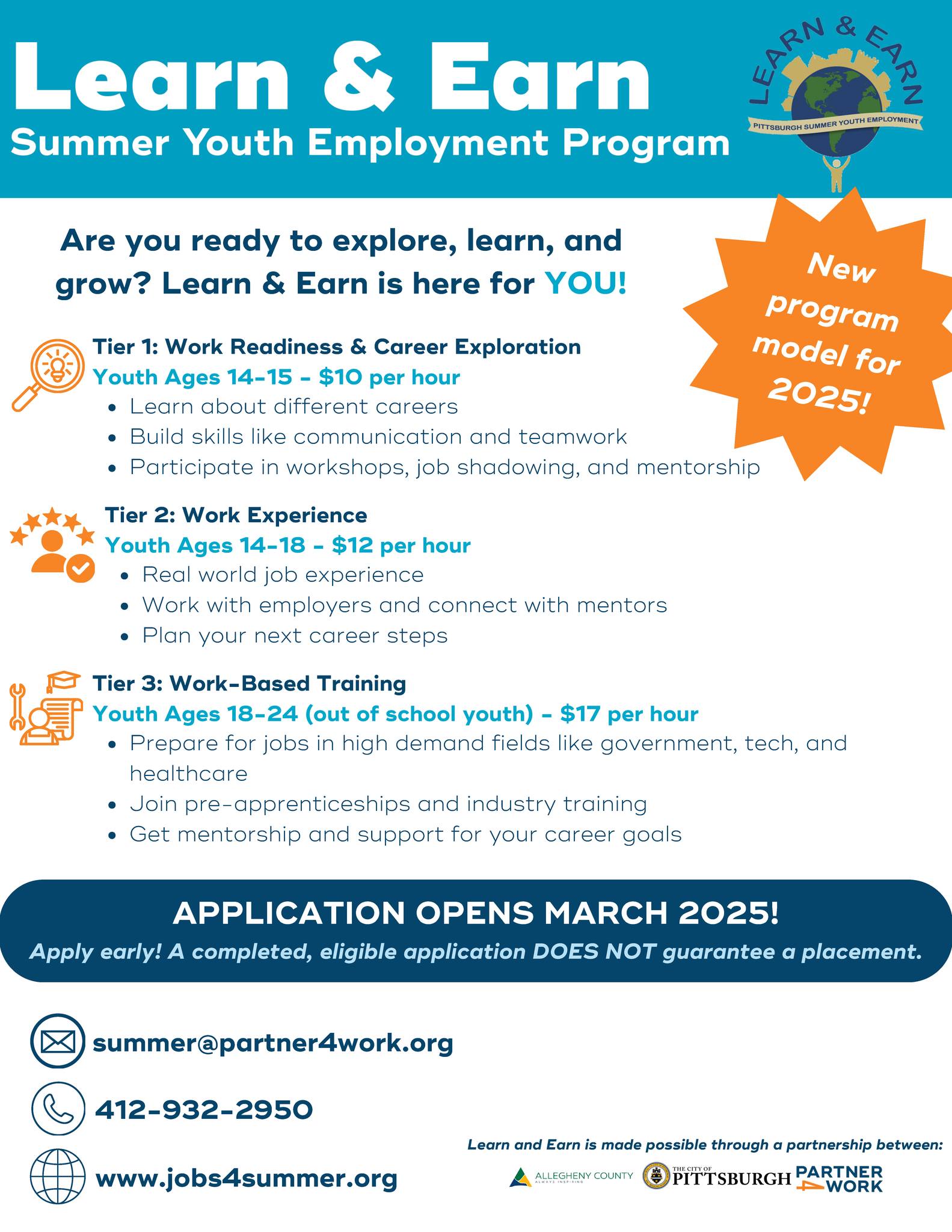 The Learn & Earn Summer Youth Employment Program (Learn & Earn) is designed to provide meaningful work experiences and career exposure to low-income young adults ages 14-24, residing in Allegheny County. The application period is from 3/2/26 to 6/5/26, with youth placements between 4/2/26 and 7/2/26