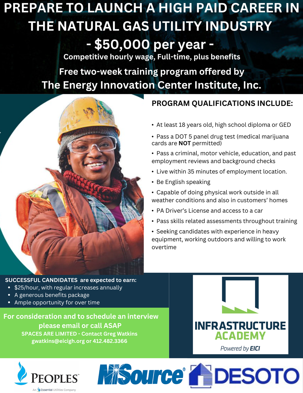 The Energy Innovation Center Institute is launching a groundbreaking joint gas training cohort as part of our Infrastructure Academy Initiative. Successful graduates can look forward to a full-time starting wage of $25.00 per hour, along with a generous benefits package and ample opportunities for overtime. To be eligible for this unique program, candidates must meet specific qualifications, including being at least 18 years old, holding a high school diploma or GED, and passing a DOT 5 panel drug test. Other requirements include English proficiency, a clean record in various reviews, physical capability for the job, and a willingness to relocate as needed. Contact Program Manager Greg Watkins at gwatkins@eicigh.org or 412-482-3366.