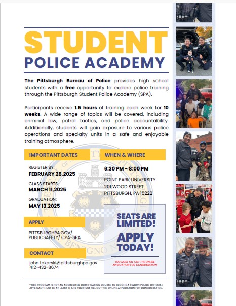 The Pittsburgh Bureau of Police provides high school students with a free opportunity to explore police training through the Pittsburgh Student Police Academy (SPA). Participants receive 1.5 hours of training each week for 10 weeks. A wide variety of topics will be covered, including criminal law, patrol tactics, and police accountability. Register by 2/27/26 to attend classes starting 3/10/26!