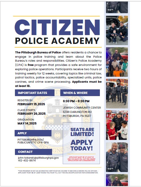 The Pittsburgh Bureau of Police offers residents a chance to engage in police training and learn about the Police Bureau's roles and responsibilities. Citizen's Police Academy (CPA) is a free program that provides a safe environment for exploring police operations. Participants receive two hours of training weekly for 12 weeks, covering topics like criminal law, patrol tactics, police accountability, specialized units, police canines, and crime scene processing. Register by 2/13/26 to start attending classes on 2/25/26!