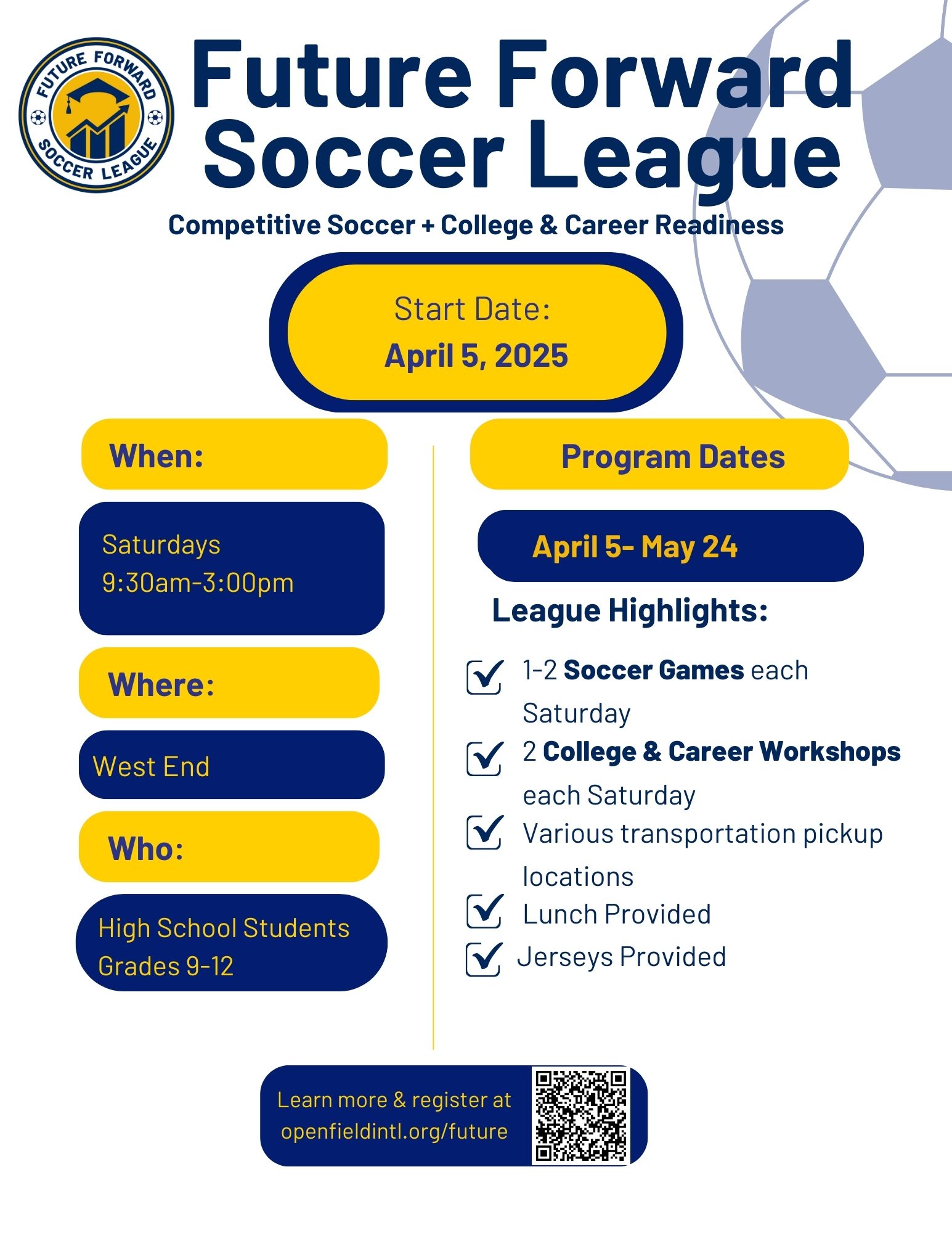 Future Forward is Open Field’s newest initiative for teenagers in the Pittsburgh region. The goal is to promote post-secondary education success through the world’s most popular sport: soccer. The Future Forward Soccer League combines soccer games with enrichment workshops to support student athletes on their path to success. Every Saturday will feature 1-2 games from 9:30AM-3PM as well as college and career workshops. Lunch and jerseys will be provided, and various pickup locations for transport will be available.