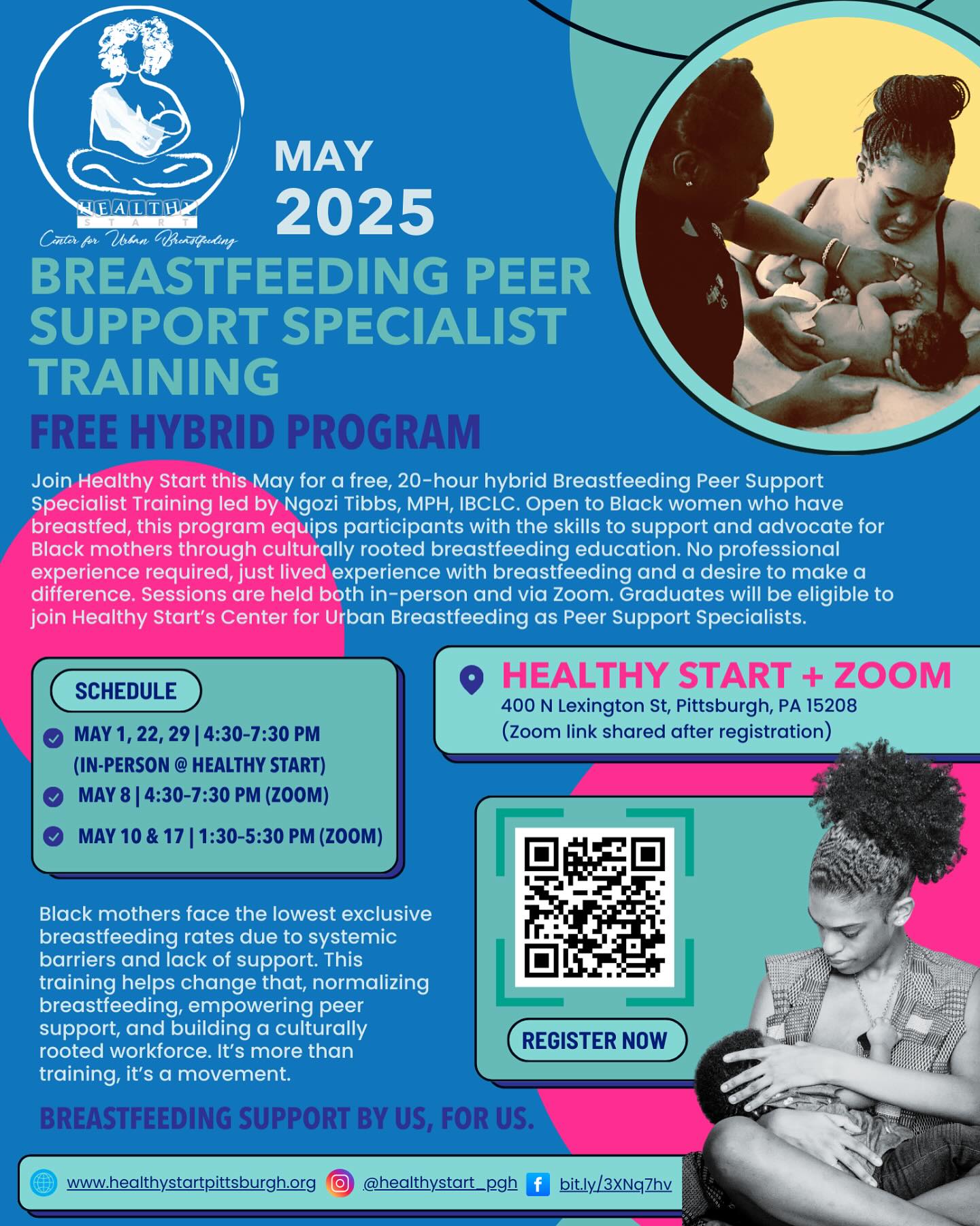 Join Healthy Start this May for a free, 20-hour hybrid Breastfeeding Peer Support Specialist Training led by Ngozi Tibbs, MPH, IBCLC! Open to Black women who have breastfed, this program equips participants with the skills to support and advocate for Black mothers through culturally rooted breastfeeding education. No professional experience required, just lived experience with breastfeeding and a desire to make a difference. Sessions are held both in-person and via Zoom. Graduates will be eligible to join Healthy Start’s Center for Urban Breastfeeding as Peer Support Specialists.