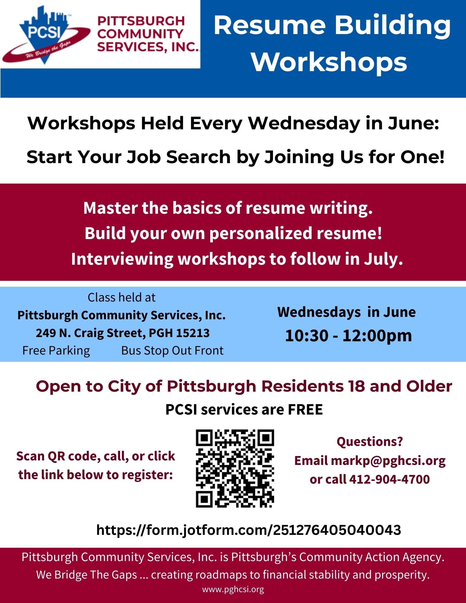 Every Wednesday in June from 10:30 AM to 12PM, Pittsburgh Community Services Inc (PCSI) is hosting resume building workshops! Master the basics of resume writing and build your own personalized resume. Interviewing workshops will follow in July. Classes will be held at 249 N. Craig St, Pittsburgh, PA 15213.