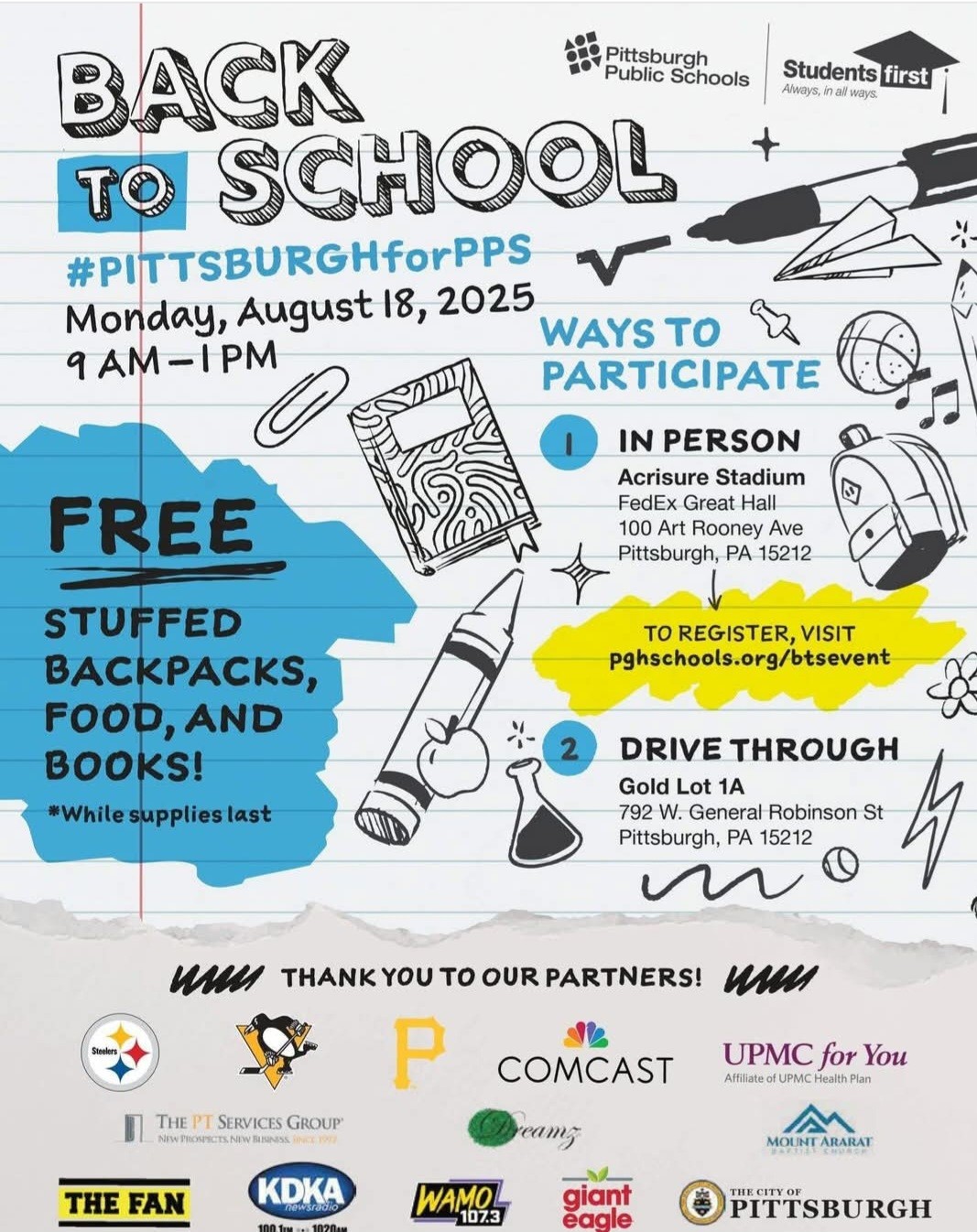 On August 18th, join Pittsburgh Public Schools in a Back-to-School event! Receive free stuffed backpacks, food, and books while supplies last! The drive through will be held from 9AM - 1PM at 792 W. General Robinson St, Pittsburgh, PA 15212.