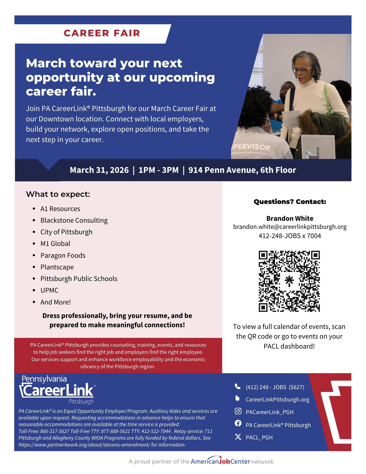 On March 31st, join PA CareerLink Pittsburgh for its March Career Fair at 914 Penn Ave! Connect with local employers like A1 Resources, Blackstone Consulting, City of Pittsburgh, M1 Global, Paragon Foods, Plantscape, PPS, UPMC, and more! Build your network, explore open positions, and take the next step in your career. Dress professionally, bring your resume, and be prepared to make meaningful connections!