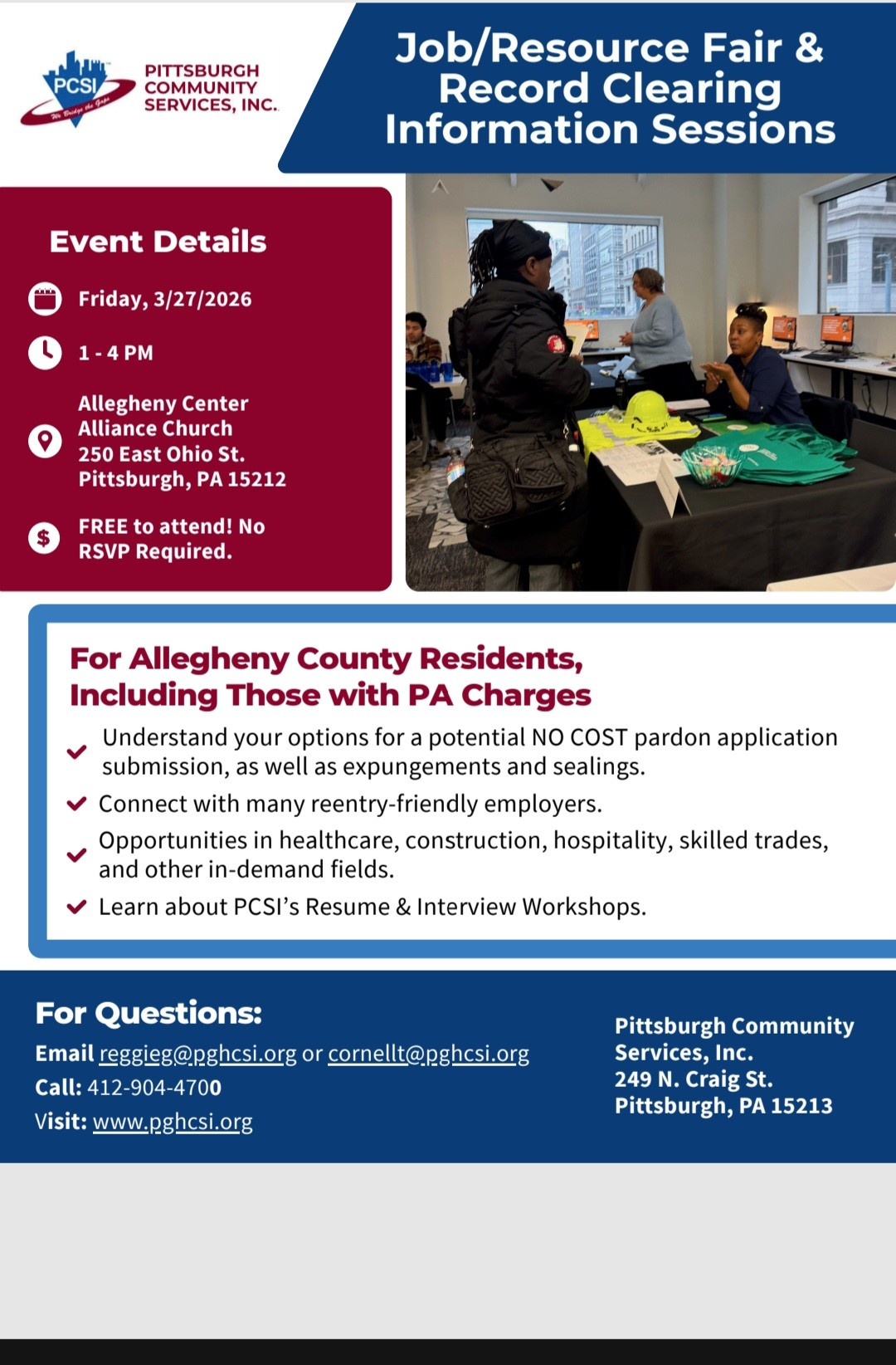 On March 27th, join PCSI in its FREE Job / Resource Fair & Record Clearing Information Sessions! Understand your options for a potential NO COST pardon application submission, as well as expungements and sealings. Additionally, connect with many reentry-friendly employers! There are opportunities in healthcare, construction, hospitality, skilled trades, and other in-demand fields. The event is from 1 - 4PM at 250 E Ohio St in the Allegheny Center Alliance Church.