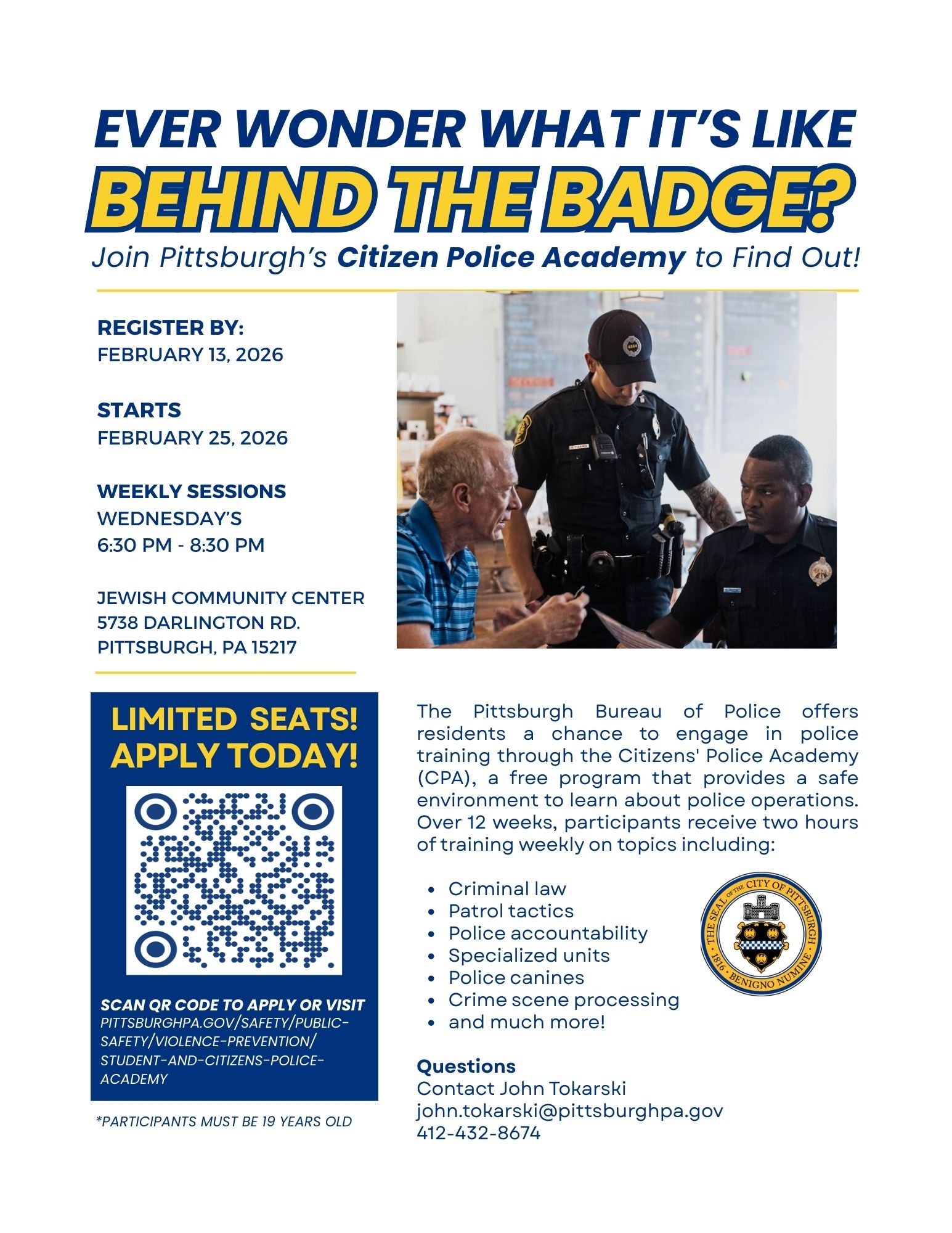 The Pittsburgh Bureau of Police offers residents a chance to engage in police training and learn about the Police Bureau's roles and responsibilities. Citizen's Police Academy (CPA) is a free program that provides a safe environment for exploring police operations. Participants receive two hours of training weekly for 12 weeks, covering topics like criminal law, patrol tactics, police accountability, specialized units, police canines, and crime scene processing. Register by 2/13/26 to start attending classes on 2/25/26!