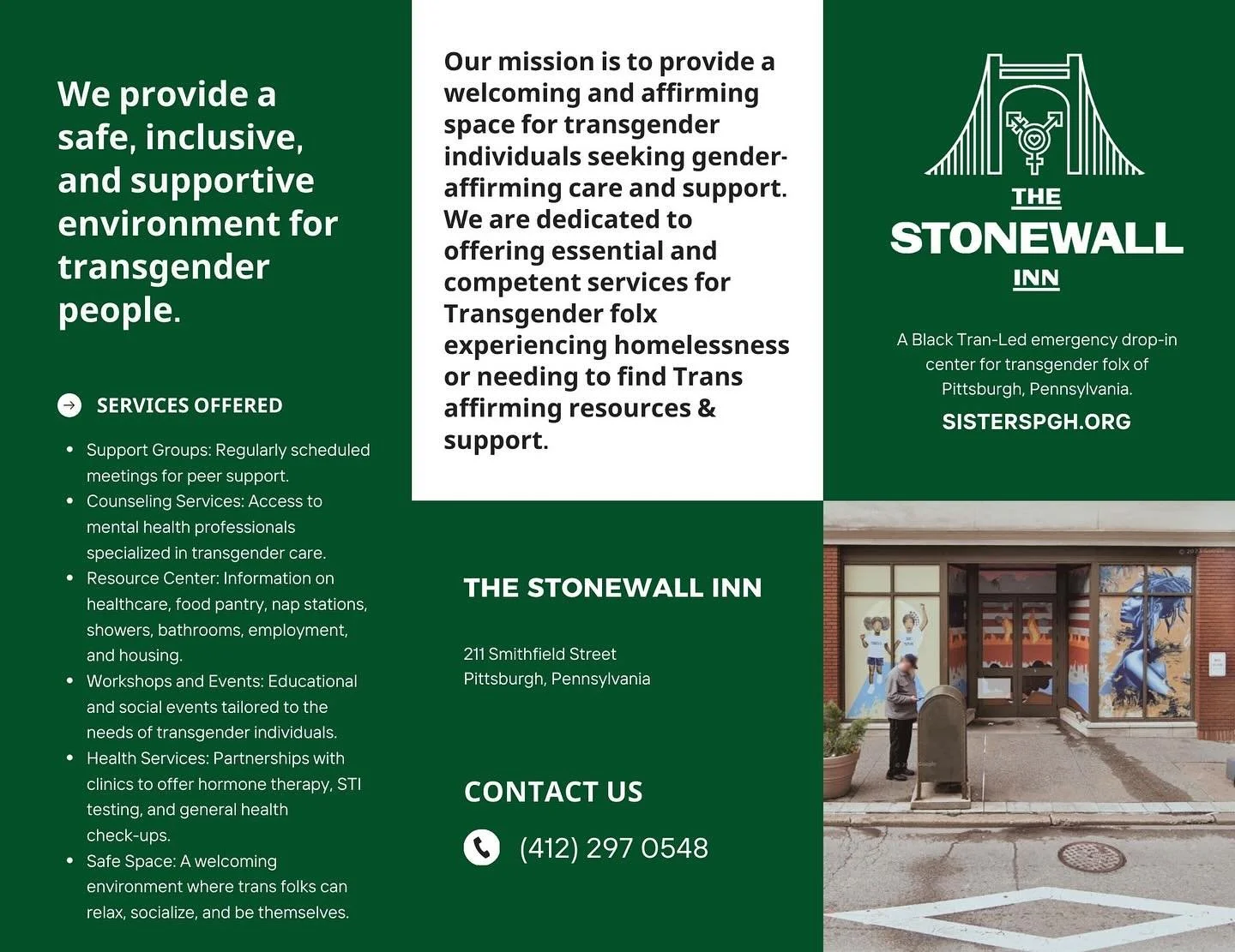 The Stonewall Inn is a Black Trans-led emergency drop-in center providing a safe, inclusive, and supportive environment for transgender people in Pittsburgh. Our mission is to provide a welcoming and affirming space for transgender individuals seeking gender-affirming care and support. We are are dedicated to offering essential and competent services for transgender folx experiencing homelessness or needing to find Trans affirming resources and support.